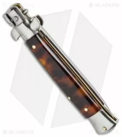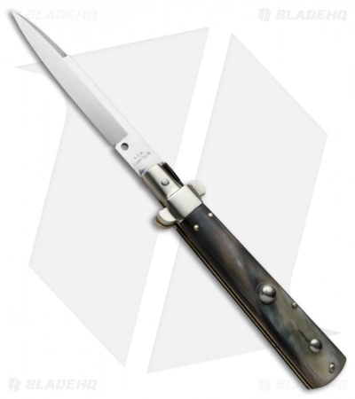 A.G.A Campolin presents this hand-crafted traditional stiletto direct from Italy. This beautiful knife features an AISI 420 stainless steel bayonet blade with a flared bolster lock on the spine. The push button release gives smooth and quick action, and there is a sliding safety button to guard against accidentally opening the blade.