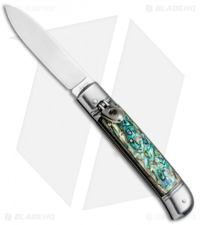This 8″ Italian Stiletto from AKC comes in the Lever Lock Shot Puller style with an abalone handle and a flat grind blade. AKC specializes in collectible Italian stilettos made with traditional knife-making techniques. This 8″ Lever Lock model has an abalone handle with a sturdy stainless steel liner. Brass pins and nickel silver liners add a classic finishing touch to the design. The blade comes in a dagger style with a plain edge and a polished finish. Add classic Italian style to your collection with the AKC 8″ Lever Lock stiletto.