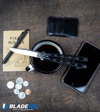 The Bear & Son 114 features a tough black epoxy coating over the handles. It offers a skeletonized design to reduce weight for smooth flipping action. The stainless steel blades are satin finished with a plain edge and a dull trainer blade. Single tang pin construction provides an excellent flipping platform. The Bear & Son 114 is a nice mid-range butterfly knife with made in the USA quality!