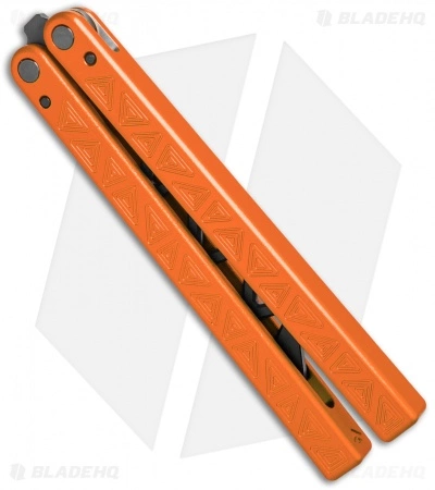 This Desert Orange balisong trainer features a black blade and orange handles.