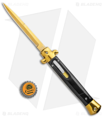 Pick up a unique and collectible design with the Mago 11″ Italian Stiletto OTF automatic knife. This OTF model is built with a black marbled acrylic handle and a gold finished bayonet blade. It features classic Italian made craftsmanship and a dependable double-action OTF mechanism. Item includes a nylon sheath for secure belt carry.