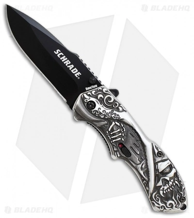 The Schrade Boneyard Series Reaper features MAGIC assisted opening action and a Grim Reaper themed handle design. It sports a black finished AUS-8 drop point blade with deep notched jimping for secure handling. The decorative aluminum scales are contoured for comfort and come fitted with a sliding safety lock and a tip-down stainless steel pocket clip.