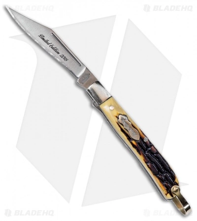 - Single blade pocket knife with a stag delrin handle and a brass lanyard loop.